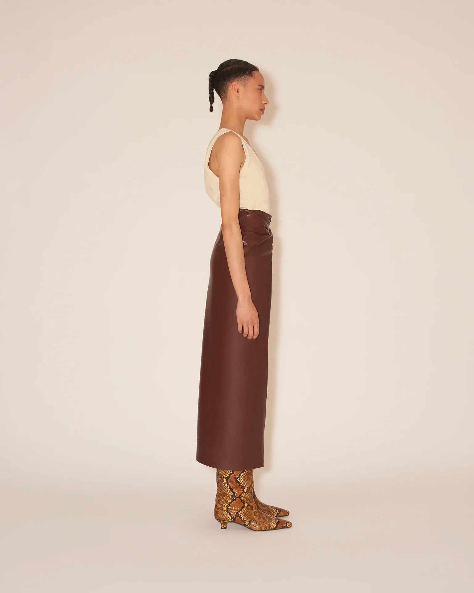 The sarong-inspired cut of the Leane skirt ensures effortless elegance. Cut from our unique OKOBOR? alt-leather in plum chutney, a twisted knot front adds waist definition to the style which falls long on the leg.